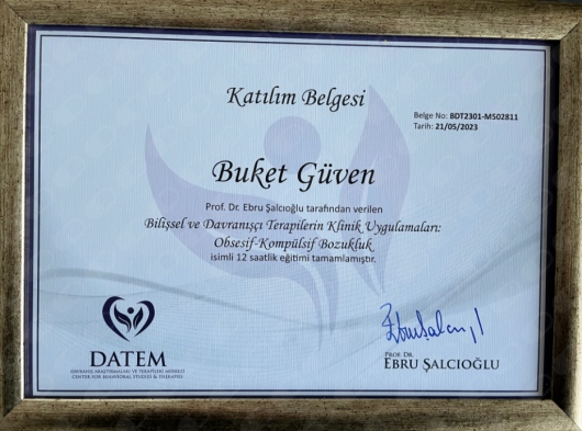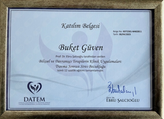 Buket hanıma eski eşimle boşanma dönemimizde oğlumun rahat geçirmesi için başvurduk. Oğluma söylenmesi, evlerin ayrılması ve birçok değişiklikte bize çok güzel eşlik etti. Terapi sürecine hala devam etmekteyiz ve çok memnunuz.