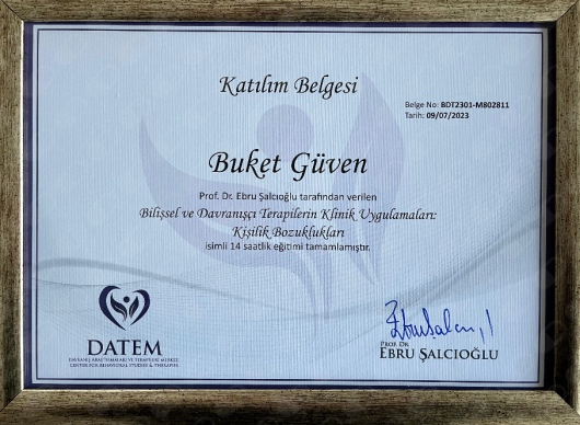 Yaşadığım son ilişkiden sonra kendimi çok değersiz ve mutsuz hissettiğim bir döneme girdim. Kendimi sevmek konusunda bile kararsızdım. Buket hanımla birlikte iç seslerime kulak vermeye başladım. Özşefkat kavramı üzerinde çok çalıştık. Terapi sürecinden sonra geçmiş travmalarımdan kaynaklı yaşadığım sorunları fark edebilir noktaya geldim. İnsanlarla ilişkilerim ve kendimle ilişkim daha iyi oldu. Benim için çok anlamlı ve kendimi keşfettiğim bir süreç oldu. Kesinlikle tavsiye ederim.