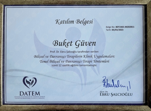 Buket hanıma yaşadığım ilişkideki bazı problemler nedeniyle başvurdum. İletişim kurarken yaptığım yanlışları görmeme yardımcı oldu. Bunların nedenleri ve çocukluk travmalarımı fark ettikçe benim tutumlarım da daha iyi hale geldi. Bu farkındalık arkadaşlık ve iş hayatımdaki diğer ilişkilerimi de olumlu yönde etkiledi. Güleryüzü ve samimi iletişimi sayesinde çok güzel bi süreç geçirdik, tavsiye ederim kesinlikle.